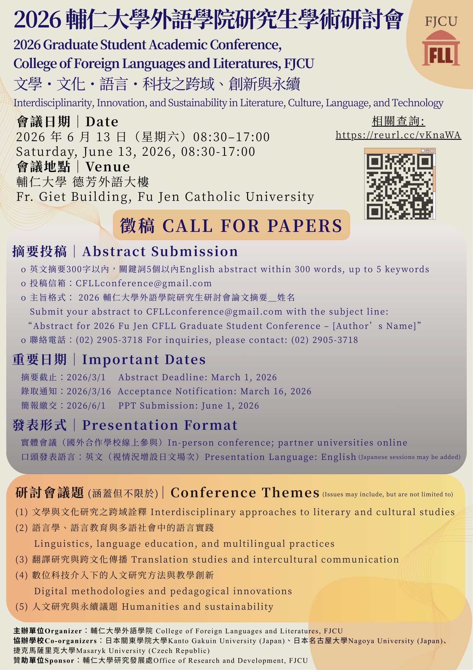 To promote academic exchange among graduate students from College of Foreign Languages and Literatures, Fu Jen Catholic University, College of Intercultural Studies, Kanto Gakuin University (Japan), Nagoya University Graduate School of Humanities/ School of Humanities, Nagoya University (Japan), and Department of Chinese Studies, Masaryk University (Czech Republic), and to deepen cultural understanding while fostering scholarly research, the College of Foreign Languages and Literatures at Fu Jen Catholic University will host the First Graduate Student Academic Conference in 2026.