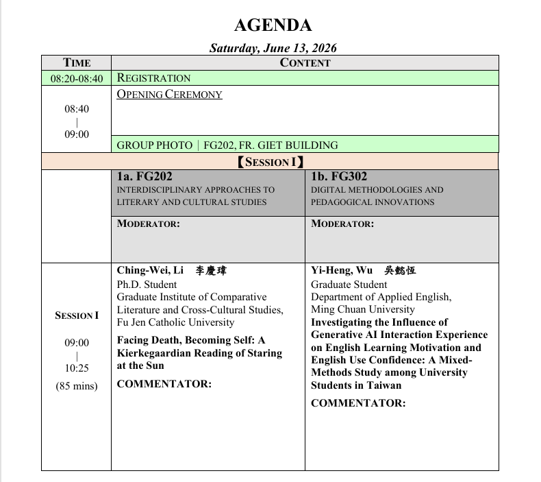- Venue: Fr. Giet Building, College of Foreign Languages and Literatures, Fu Jen Catholic University