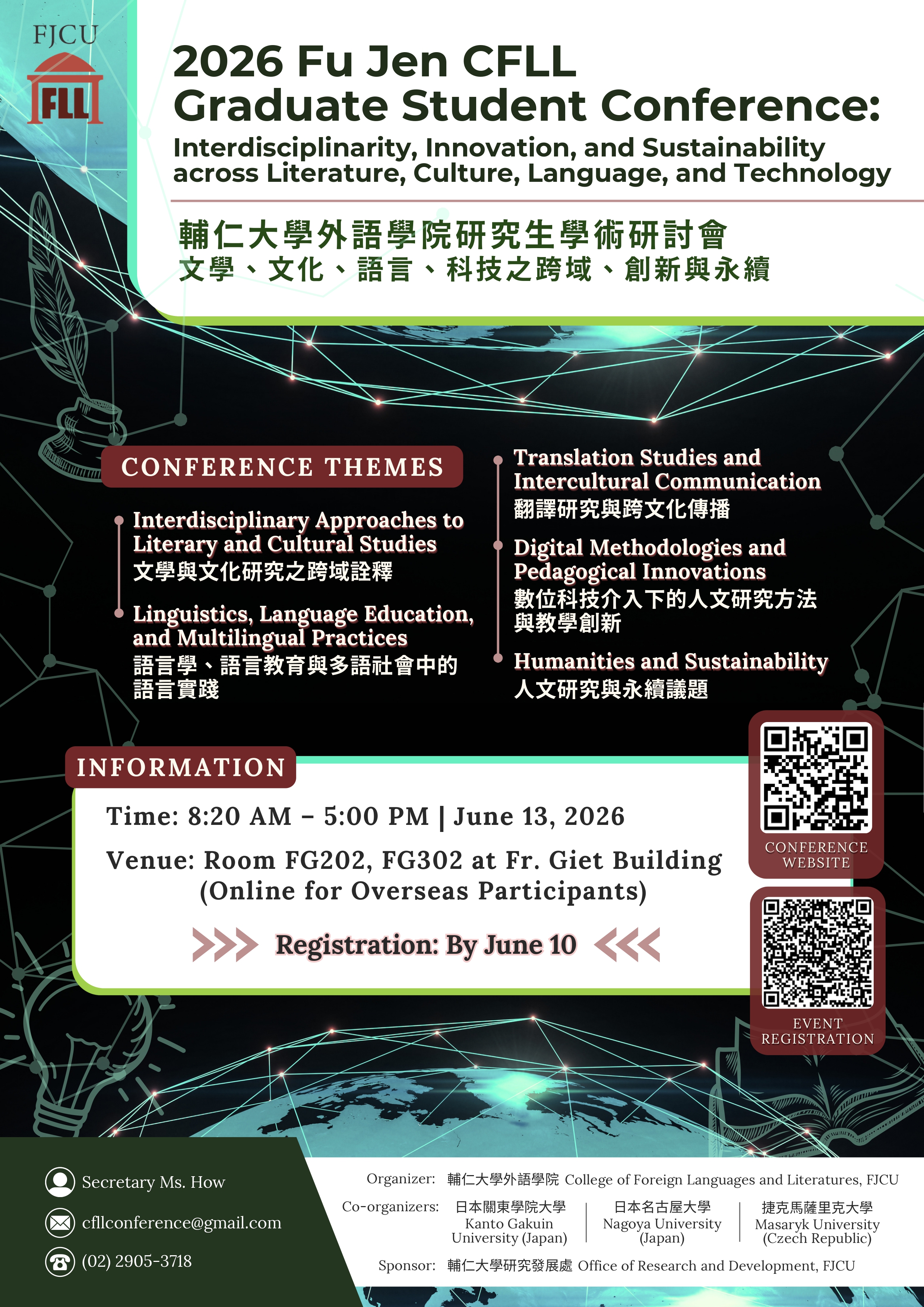 To promote academic exchange among graduate students from College of Foreign Languages and Literatures, Fu Jen Catholic University, College of Intercultural Studies, Kanto Gakuin University (Japan), Nagoya University Graduate School of Humanities/ School of Humanities, Nagoya University (Japan), and Department of Chinese Studies, Masaryk University (Czech Republic), and to deepen cultural understanding while fostering scholarly research, the College of Foreign Languages and Literatures at Fu Jen Catholic University will host the First Graduate Student Academic Conference in 2026.